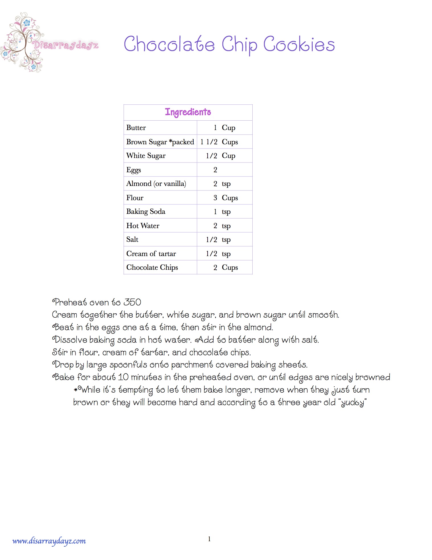 Chocolate Chip Cookies Share this: Print (Opens in new window) Print TweetLike Loading... Published by disarraydayz I strive to live life to the fullest and enjoy every groovy experience I am blessed with. Food is my calling.... too bad the kitchen smoke alarm doesn't always agree. View all posts by disarraydayz
